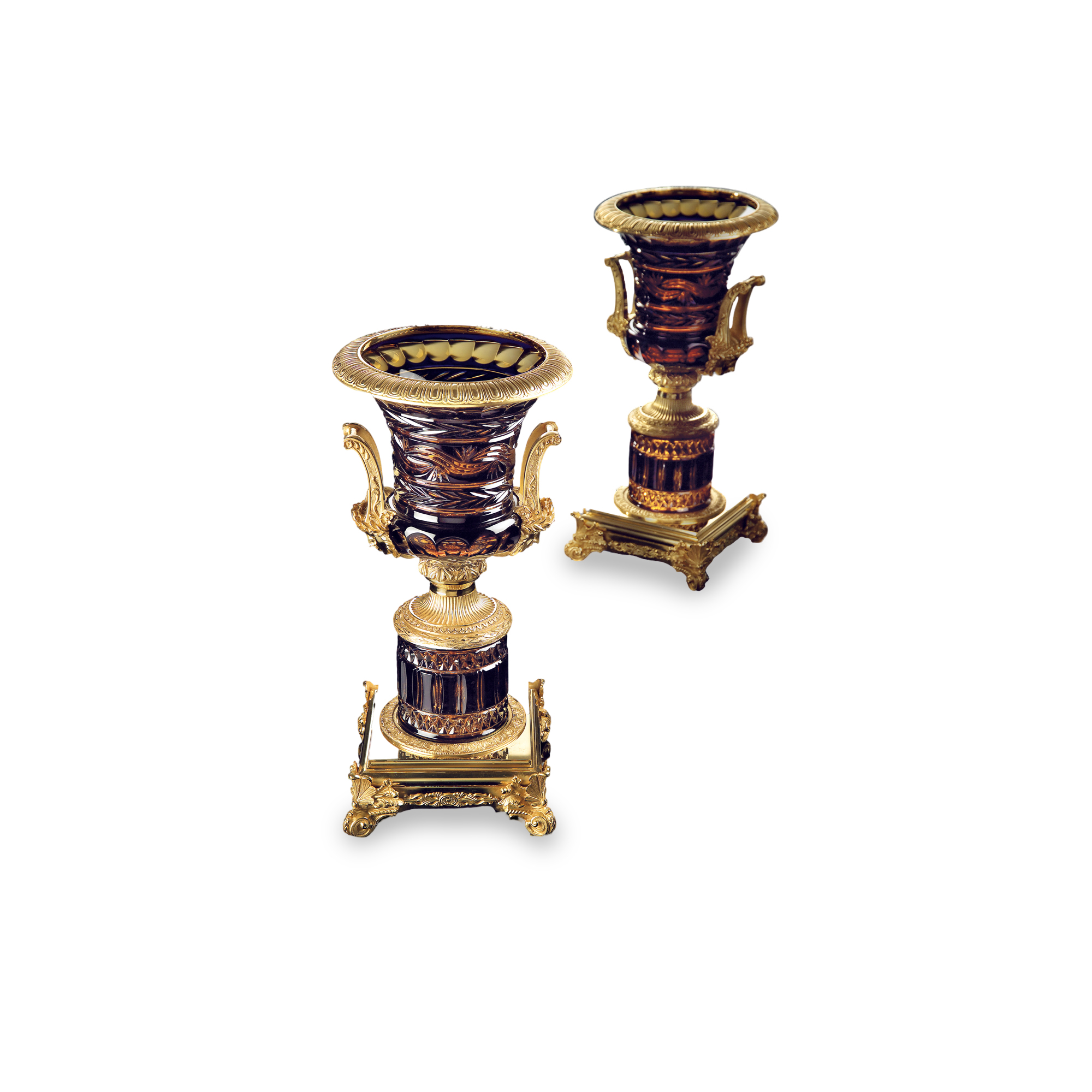 Caterina Vase Impero Teste Handles In 24% Lead Amber/Blue Crystal Polish Baccara Cut With 24K Gold-Plated Bronze